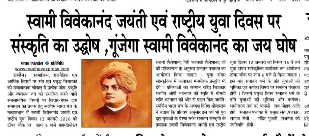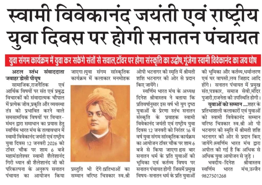 12 जनवरी को स्वामी विवेकानंद जी जयंती एवं राष्ट्रिय युवा दिवस पर उज्जैन में होगी स्वर्णिम भारत मंच के बैनर तले सनातन पंचायत